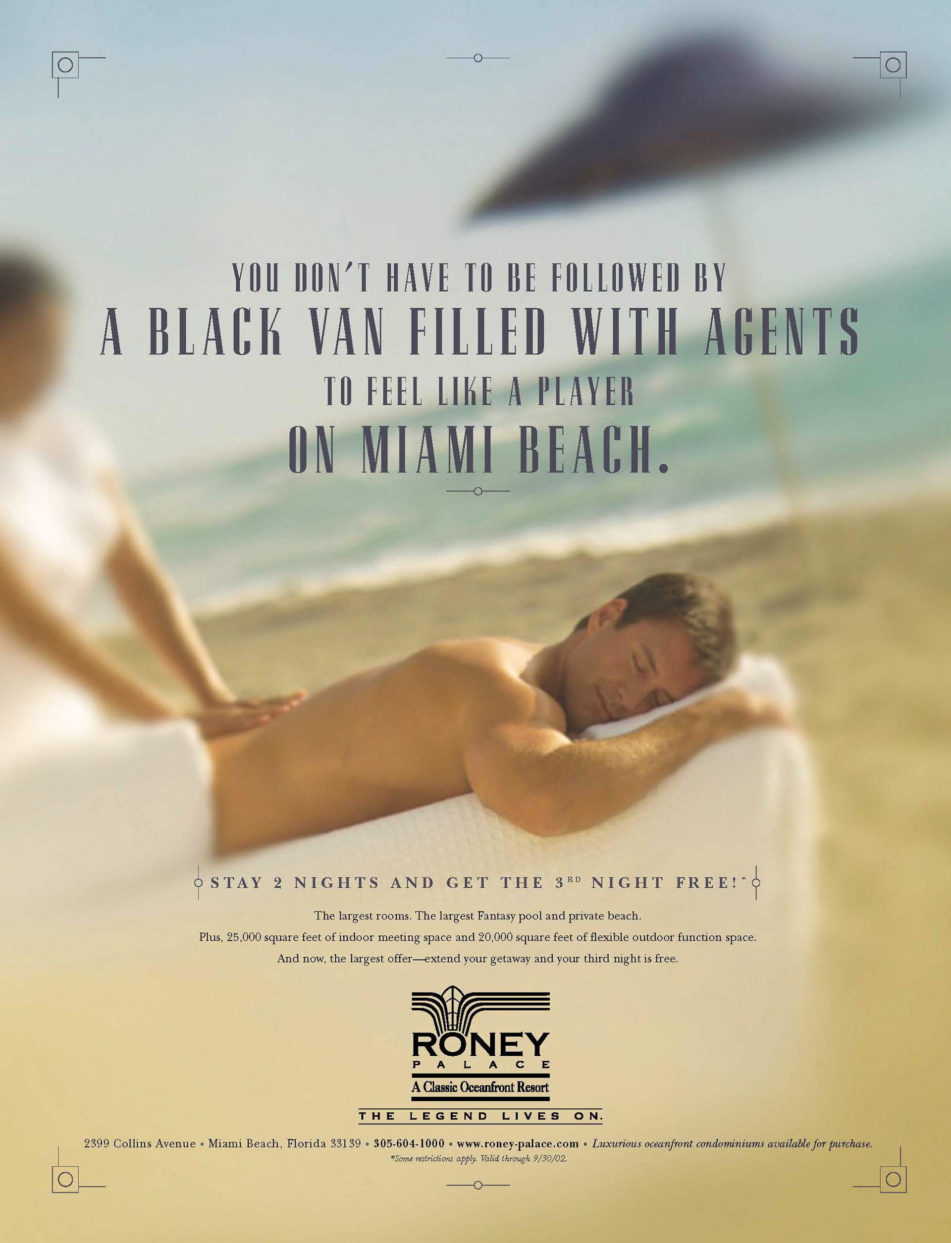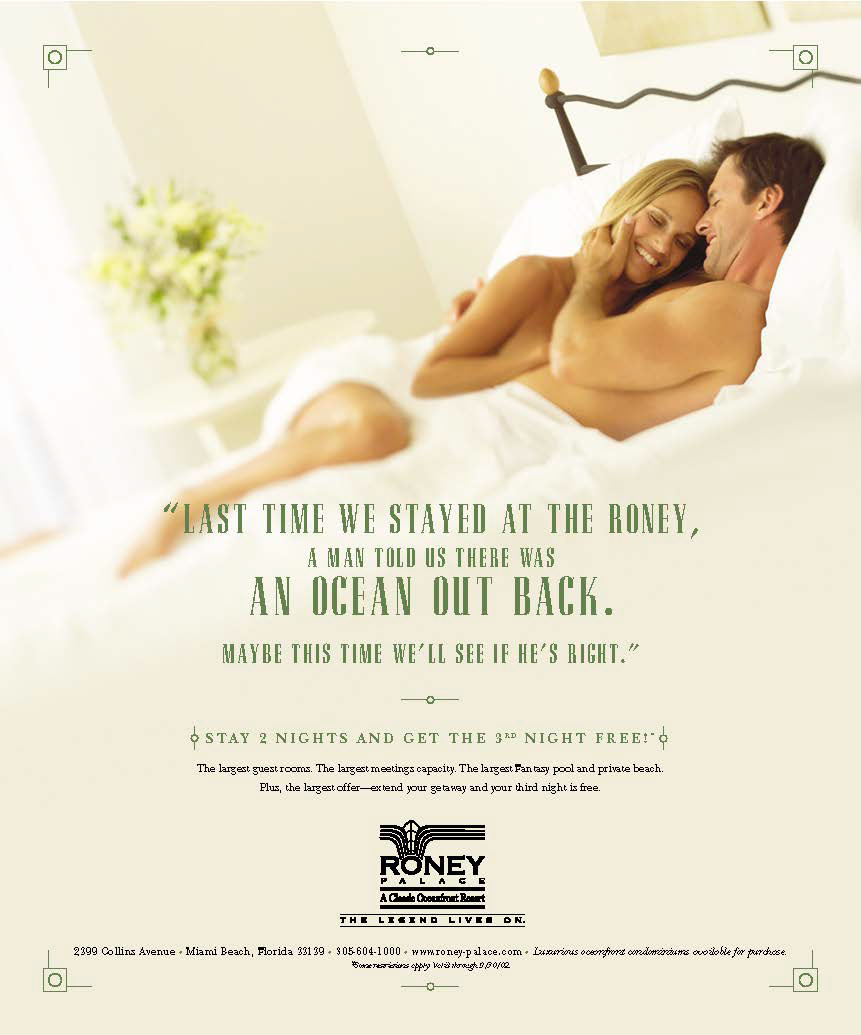 The aging Rony Palace on Miami Beach got a facelift and needed a new brand. This campaign was highly successful at increasing room night among local Miami residents looking for a beach getaway.